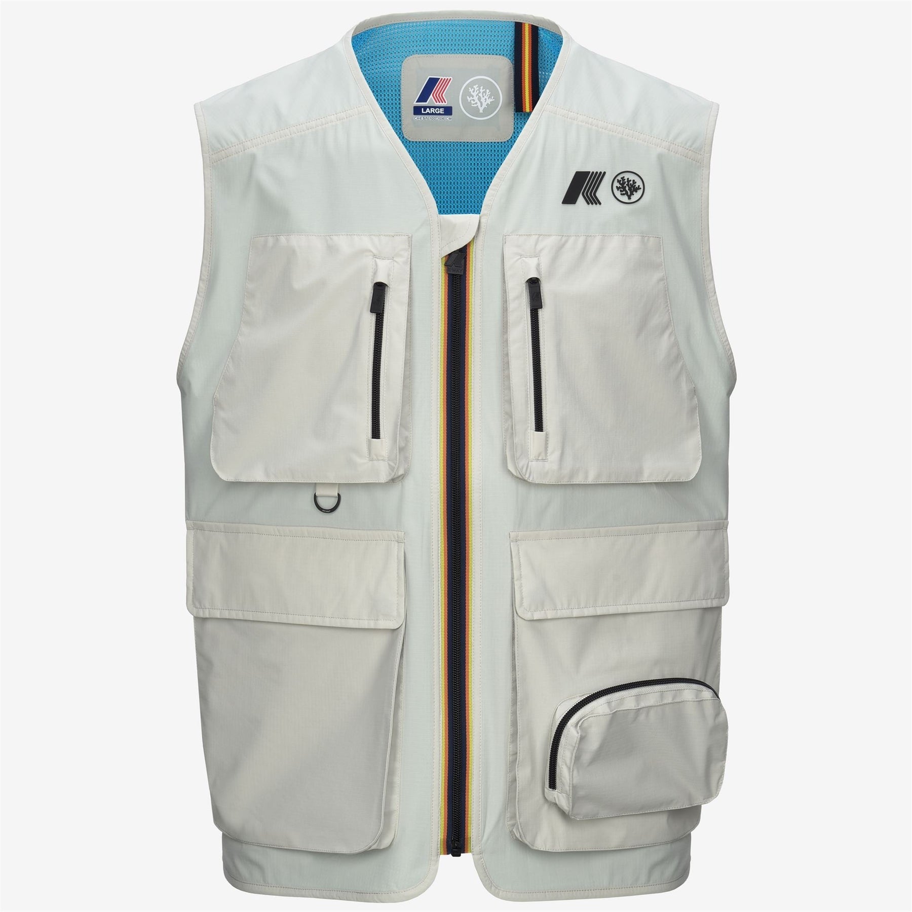 Allos est un gilet fabriqué en matière ripstop en nylon recyclé avec une coupe régulière qui facilite le mouvement et la ventilation lors des activités sportives. L'attention portée aux détails fonctionnels est mise en avant par la fermeture éclair et les poches pratiques, idéales pour ranger les petits essentiels lors des activités en plein air. L'intérieur est doublé de maille bleu clair. Il est personnalisé avec le logo K-WAY x CORAL GARDENERS.
